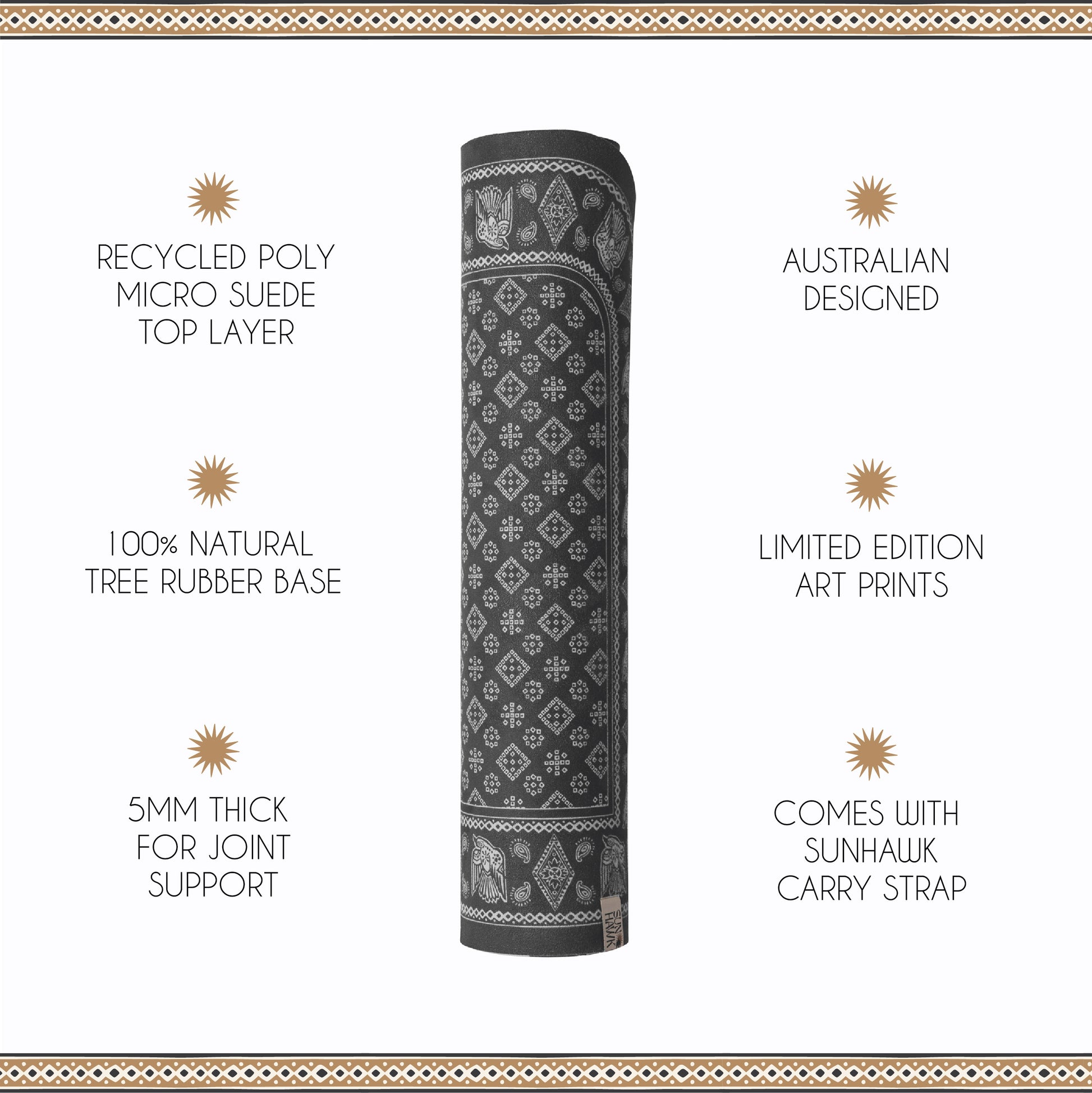 Our signature SunHawk yoga mat brings a bandana style artwork to your home and yoga practice. Australian designed with a simple charcoal & ivory colour palette that complements your home decor, so you can leave this yoga mat set up and ready to go for your morning stretch as part of your daily ritual.